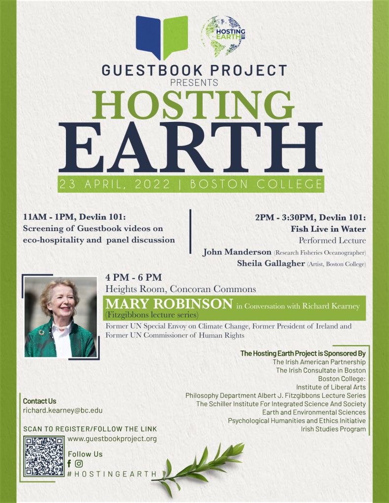 In April 2022, Guestbook Project held “Hosting the Earth,” an event engaging with the question of ecological hospitality by asking what it means to be guests of the earth as well as hosts. Mary Robinson, former President of Ireland, participated in conversation with Richard Kearney.