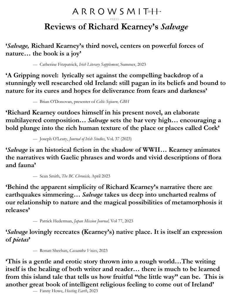 Richard Kearney’s new novel, Salvage, will be available for ordering from May 1st on the Arrowsmith website. This is the way Fanny Howe describes it: